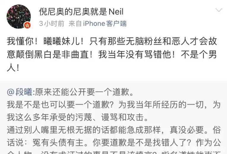 她说张杰当年是没舞台才重新参赛,全靠自己一场场拼出来的成绩,平白无故被骂了这么多年。现在还要因为薛之谦的私事被拉出来消费,凭什么?必须要薛之谦给一个正式道歉。到这里,全网都还站在谢娜这边,觉得张杰就是纯纯躺枪,受了无妄之灾。结果反转说来就来,直接给所有人干懵了!段曦直接站出来,也喊话要一个道歉!