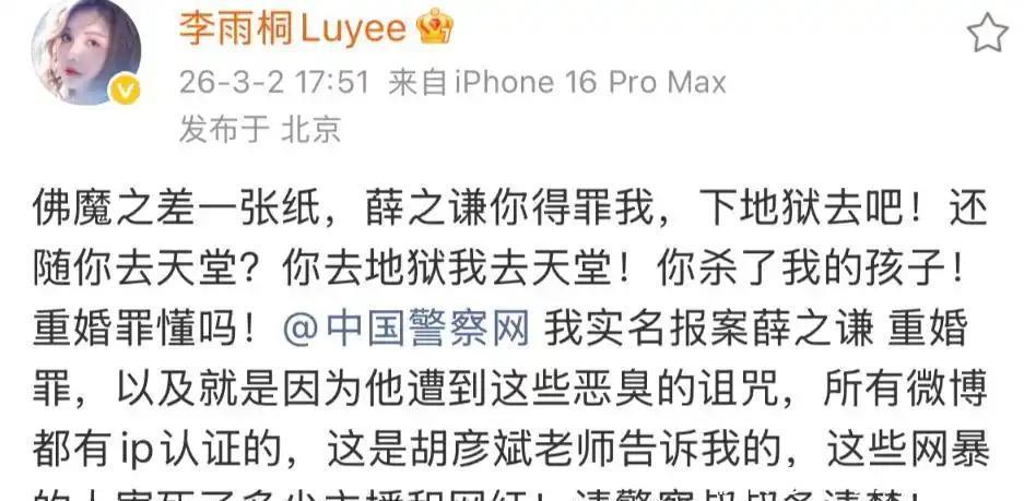 谁能想到,当年锤得薛之谦差点翻不了身的李雨桐,时隔多年直接杀了个回马枪!直接在网上实名报案,告薛之谦重婚罪!还放狠话,说对方害了自己的孩子,佛魔只差一张纸,要让薛之谦下地狱!连中国警察网都直接艾特了,架势直接拉满。