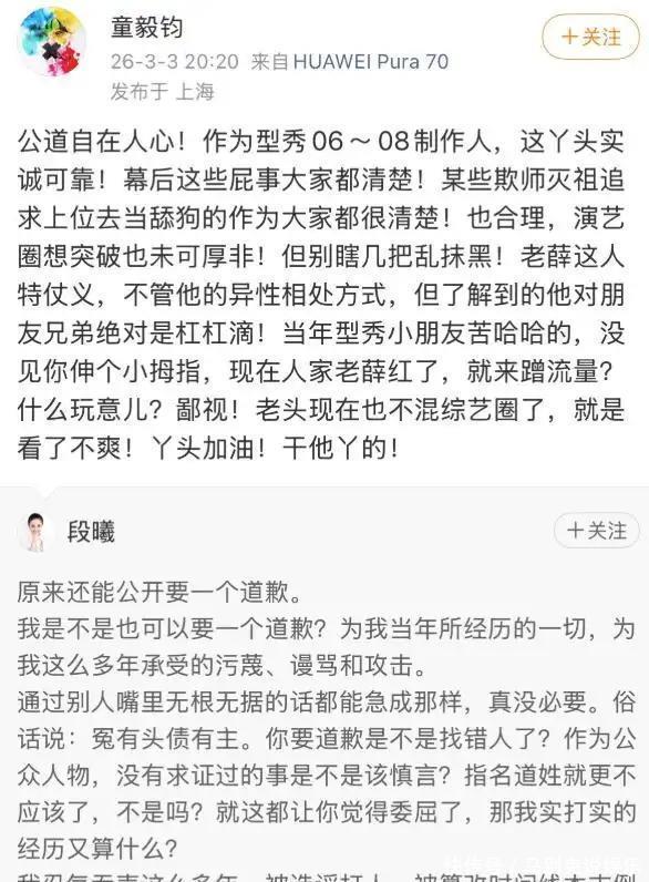 更让人没想到的是,段曦直接站出来力挺薛之谦,说他重情重义。还说当年最苦的时候,是薛之谦撑着公司帮朋友解约。所有人都走了,他才最后离开。这一下,整个舆论直接大反转!不光段曦站出来,当年的圈内人也全出来说话了。前《我型我秀》制作人童毅钧直接发文力挺段曦,说幕后的事大家门儿清,内涵张杰欺师灭祖为上位当舔狗。