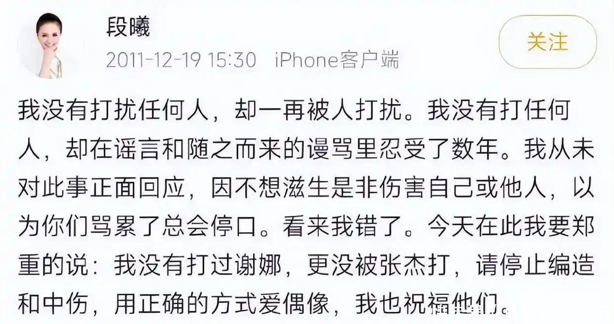 当年张杰和谢娜在一起之后,段曦就被造了十几年的黄谣。说她贪慕虚荣甩了张杰,看人家红了又回来插足。甚至造谣她当众扇了谢娜耳光,哪怕她当年就发声明澄清,可谣言还是毁了她的事业,丢了代言。