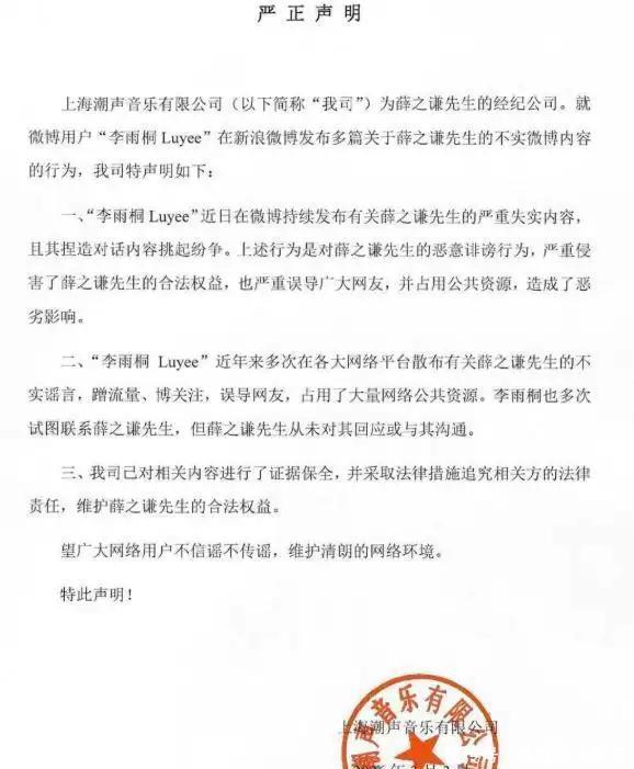 而薛之谦这边,经纪公司直接发了严正声明,说李雨桐的内容全是不实谣言,已经保全证据,要走法律程序。